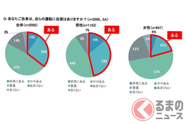 さらに、自らの運転に対する自信については、36%が「自信がある」と回答。男女で比較すると、女性に比べ、男性のほうが運転への自信は高い傾向がみられます。
