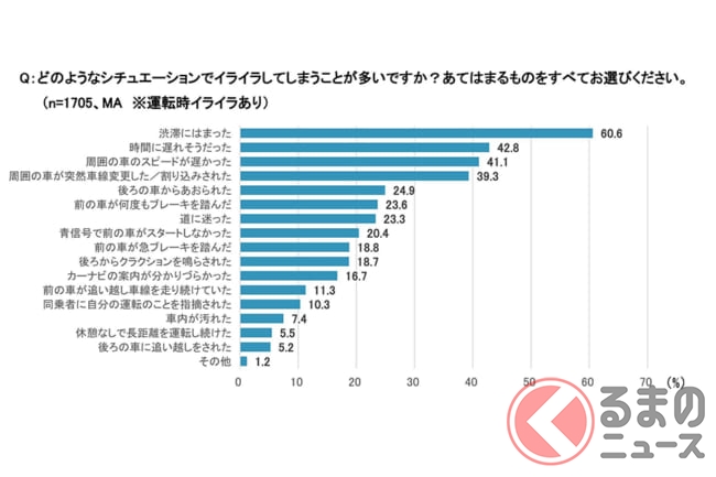 イライラするシチュエーションを聞いたところ、約6割が「渋滞にはまった」と回答し、「時間に遅れそうだった」「周囲のクルマのスピードが遅かった」など、時間やスピードに関する意見が多くみられました。