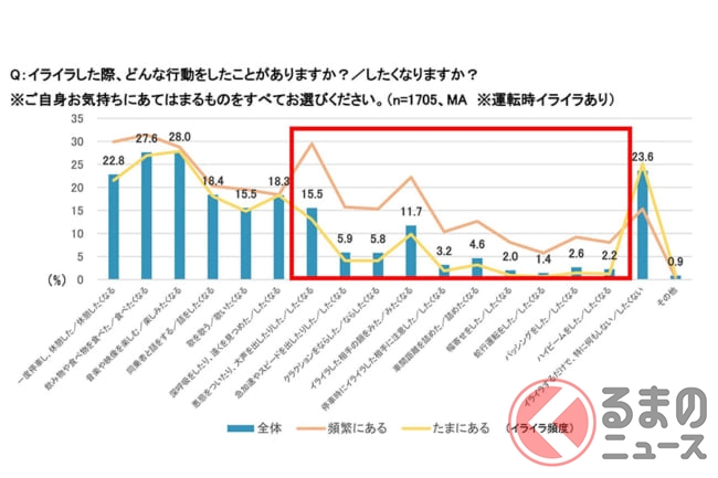 運転中にイライラすることが頻繁にある人ほど、「悪態をついたり大声をだした/したくなる」「イライラした相手の顔をみた/みたくなる」など相手をあおるような項目が高く、「急加速やスピードを出したりした/したくなる」「クラクションをならした/ならしたくなる」「停車時にイライラした相手に注意した/したくなる」「パッシングをした/したくなる」「ハイビームをした/したくなる」「幅寄せをした/したくなる」など、あおり運転に繋がりかねない行動をとる傾向が高いようです。