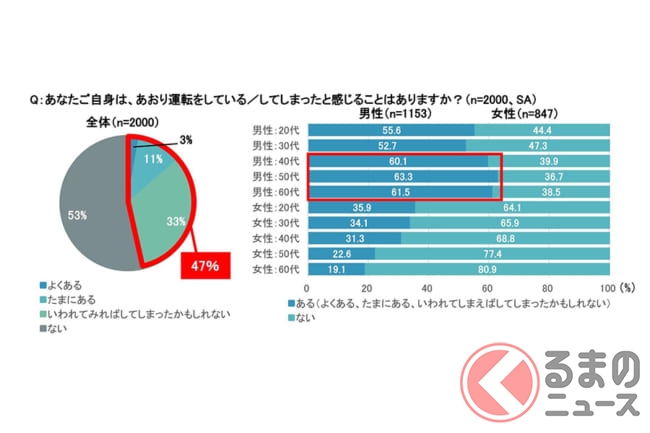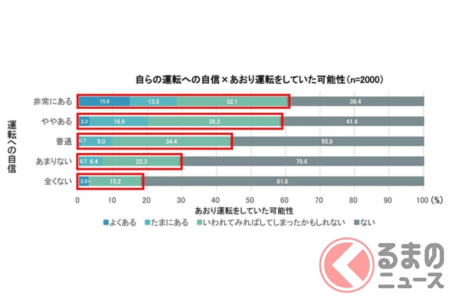 男女別でみると、特に40代以上の男性は6割超が「あおり運転をしていた可能性がある」と回答し、女性に比べ高い傾向がみられます。さらに、自らの運転に自信のある人ほどあおり運転をしていた可能性が高い傾向があることがわかりました。