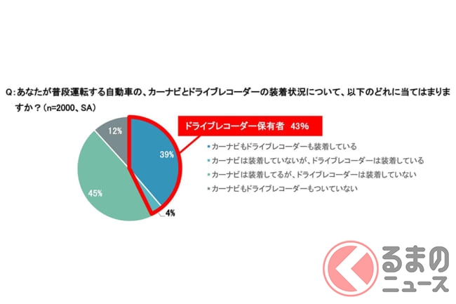 また、あおり運転対策として心がけていることは、「なるべく車間距離をとる」「不審なクルマに近づかない」が5割台、次いで「無理な割り込みはしない」「ドライブレコーダー導入」という意見が多く、ドライブレコーダーの保有者は43%、非保有者は57%という結果です。