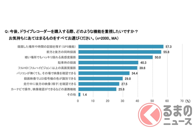 さらに、今後ドライブレコーダーを購入する際に重視する機能については、「録画した場所や時間の記録を残す(GPS機能)」が57.3%でもっとも高く、次いで「前方と後方の同時録画」、「暗い場所でもハッキリ録れる高感度撮影」と続きました。