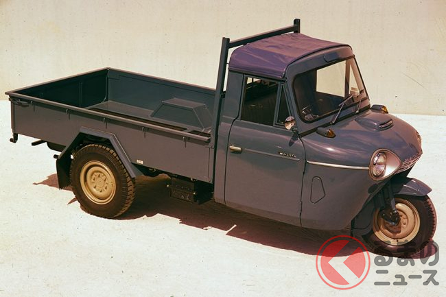 そして、さらに輸送需要が高まると3輪トラックも大型化していき、マツダは1957年に「丸ハンドル+完全鋼製キャビン」を採用し、空冷エンジンを搭載した「HBR/MBR型」を発売。