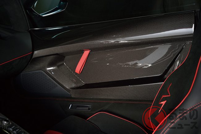 フロントバンパーはウィング形状が顕著となった。まるで牙をむいた猛獣だ。サイドステップは内にえぐるようなデザインで、リアクォーターのインテークは固定式となり、リアアンダーディフューザーもまるでレースカーのよう。特徴的な固定式リアウィング(マニュアル三段階調整式)は、ノーマル比+170%のダウンフォースを生む。ちなみに、追加されたエアロデバイスの類はすべてCFRP(カーボンファイバー)製である。