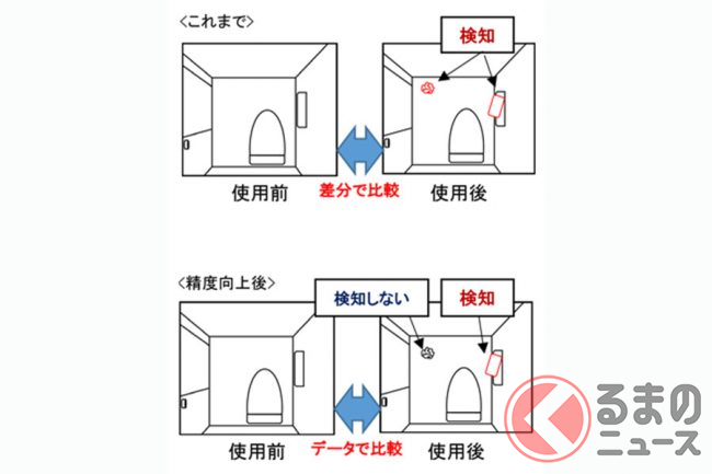 これまでは、トイレの天井に設置したセンサーが、「トイレに入る前」と「トイレから出た後」のシルエットを検知し、輪郭(アウトライン)の差をAI分析により識別していましたが、トイレットペーパーの切れ端や芯など、本来検知しなくてもよいものまで検知されている状況も見受けられたといいます。