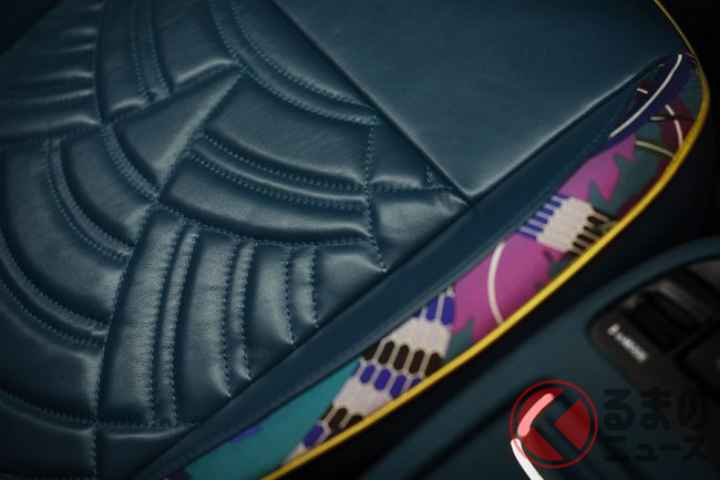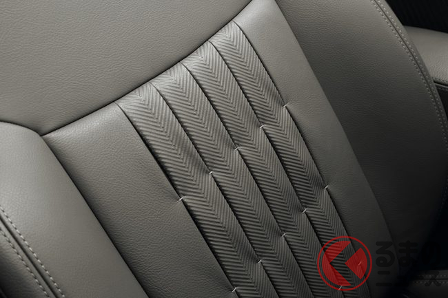 シート地はポルトローナ・フラウにより供給されたフルグレインの認証済み天然皮革を採用。カラーは「グレージュ(グレイのニュアンスのあるベージュ)」で、装飾要素としては最高品質の皮革製品に施される手作業からヒントを得て、マイクロシェブロン模様のウールバンドと組み合わせられている。