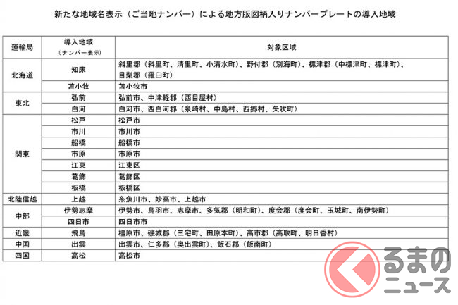 新たなご当地ナンバーは、知床・苫小牧・弘前・白河・松戸・市川・船橋・市原・江東・葛飾・板橋・上越・伊勢志摩・四日市・飛鳥・出雲・高松の17地域に関わる区域が対象となっています。