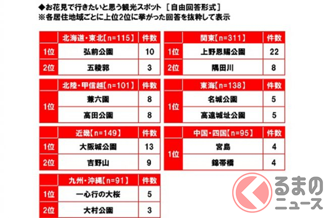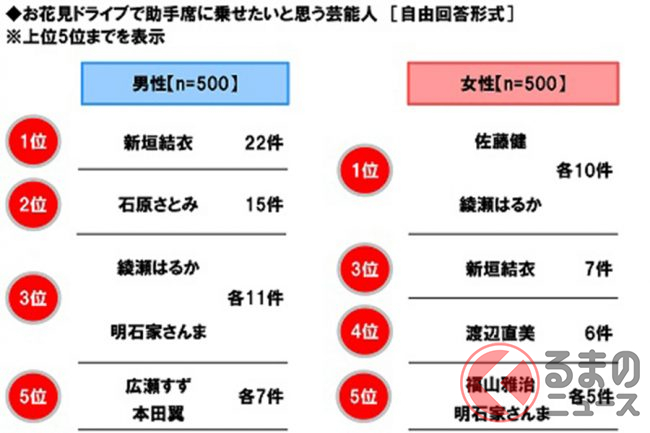 お花見ドライブで助手席に乗せたいと思う芸能人については、男性の回答では1位が「新垣結衣」、2位が「石原さとみ」、3位が「綾瀬はるか」「明石家さんま」ととなり、女性の回答では1位が「佐藤健」「綾瀬はるか」、3位が「新垣結衣」で、佐藤健が“一緒にお花見に行きたいと思う芸能人”と併せて二冠という結果でした。
