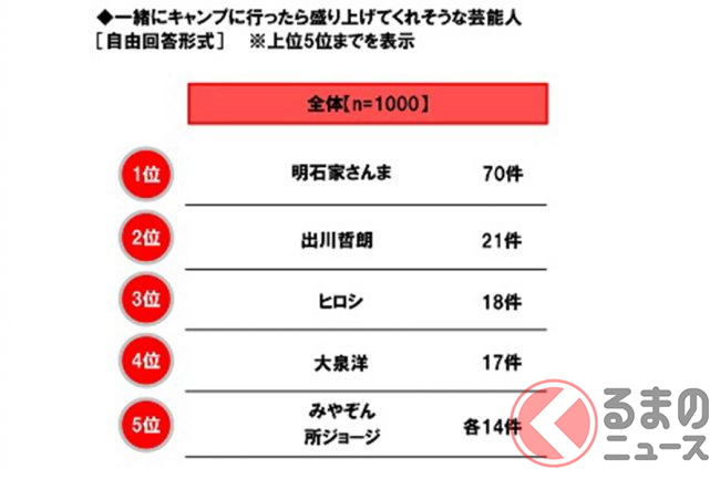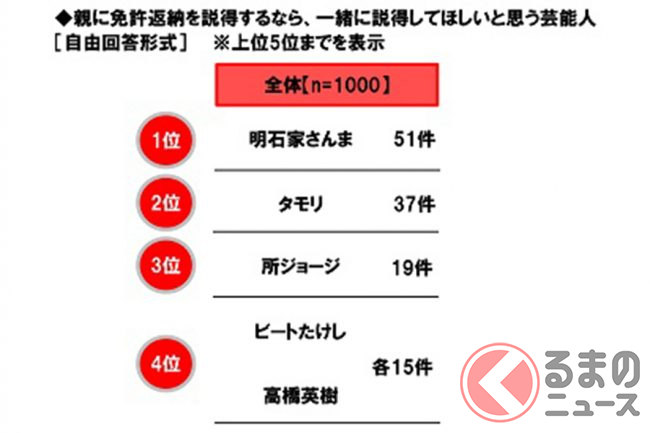 まず、 親に免許の返納を説得するなら、一緒に説得してほしいと思う芸能人を聞いたところ、1位は「明石家さんま」、2位は「タモリ」、3位は「所ジョージ」となりました。