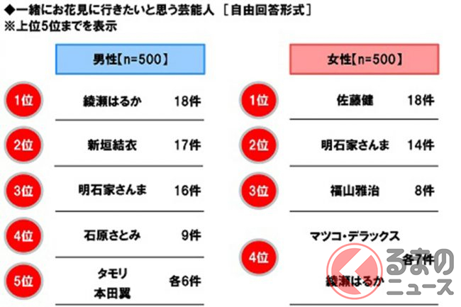 ほかにも、春のレジャーに先駆けて、一緒にお花見に行きたいと思う芸能人を聞いたところ、 男性の回答では1位が「綾瀬はるか」、2位が「新垣結衣」、3位が「明石家さんま」、女性の回答では1位が「佐藤健」、2位が「明石家さんま」、3位が「福山雅治」となりました。