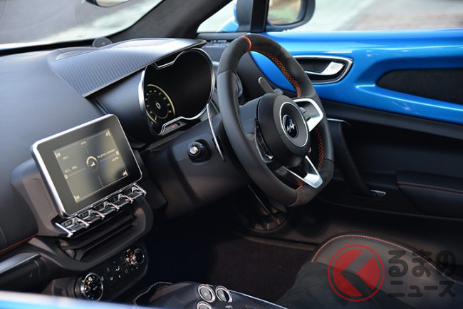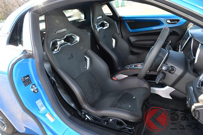室内各部にあるステッチカラーもブルーからオレンジになり、シートやステアリングホイールの差し色としておしゃれな演出になっている。ヒップポイントの低いモノコックバケットシートはサベルト製で、重量は13.1kgと軽量だ。