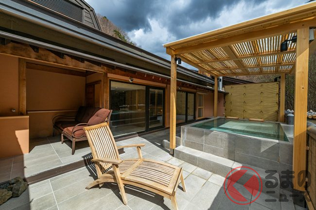 すべてがベッドタイプそして客室露天風呂付き。室内は地元産の木材(選び抜かれたカラマツや杉)を使った開放的でモダンな空間となっている。フラットソファなどを採用するなど体を開放するかのように、ゴロゴロと自由気ままに過ごせるのがいい。目にも眩しい四季折々の自然が目の前に広がり、大自然の中でくつろいでいるかのようだ。