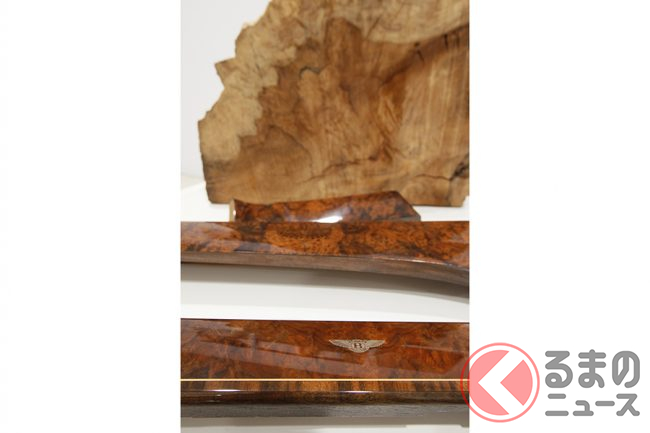 ベニヤは、職人によってミラーマッチ(左右対称に配置)され、無垢材の下地として採用される前に、極めて美しい「模様のある」部位(自然にできた装飾的紋様)のみが選び出される。ミュルザンヌの内装を、まるで工芸品の域にまで高めているのは、このミラーマッチされたベニヤによるところが大きい。