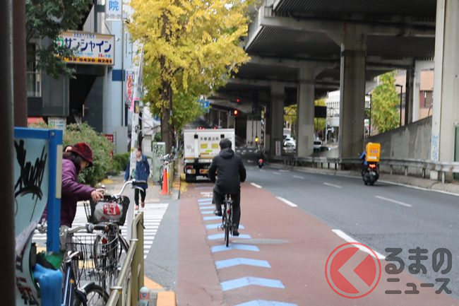 バスと同じく、自転車にも「自転車優先レーン(専用通行帯)」が存在しますが、こちらも原則としてクルマの侵入や駐車は禁止です。ただし、駐停車禁止の区間に指定されていない限りは、荷物の積み下ろしによる「短時間の停車」については可能です。