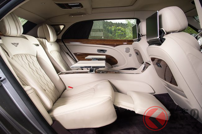 ミュルザンヌ エクステンデッド ホイールベースは、後部座席の乗員を念頭に置いて開発された。追加された250mmの後席レッグルーム、旅客機のような引き延ばしが可能なレッグレスト、リアコンパートメントサンルーフを組み合わせ、世界でもっともリラックスできる車内環境を作り出した。