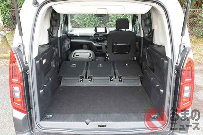 比較すると、ベルランゴはカングーよりも全長で123mm、全幅で18mm、全高は34mm大きいことになる。実際に室内では、通常の5人乗車時での荷室の広さがベルランゴのほうが圧倒的に広く感じる部分だ。
