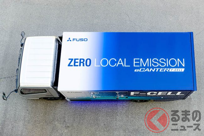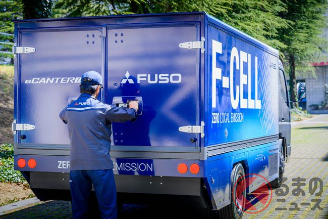 車両総重量7.5トンクラスのeCanter F-Cellは、より高いエネルギー密度の高圧水素を用いることで、最大で300kmの走行を可能にするほか、水素の充填時間も10分以内と、一般的な電気自動車の充電時間に比べて大幅に短縮しています。
