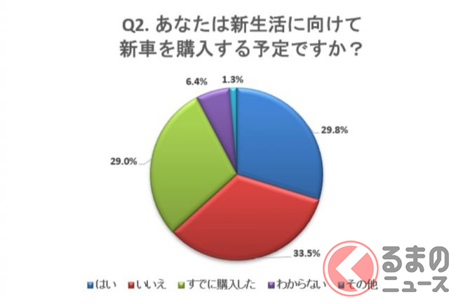 さらに、「あなたは新生活に向けて新車を購入する予定ですか?」という質問では、「はい(29.8%)」と「すでに購入した(29%)」となり、全体の6割弱が新生活で新車を購入する傾向にあるようです。