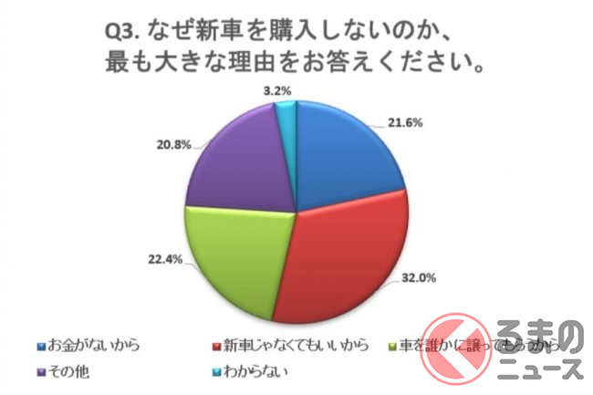 また、新車を購入しない大きな理由としては、「新車じゃなくてもいいから」という新車に価値を感じない、つまり、新車はいらないという人もいるようですが、新車には乗りたいがあきらめなければならない人も一定数いるようです。また、この結果から「お金がなければ新車には乗れない」という感覚があることも見て取れます。
