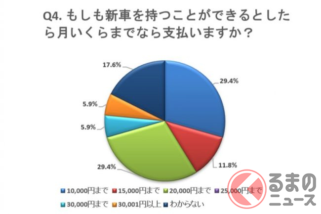 クルマが必要な新社会人のなかで、新車を買うことができなかった人の割合は33.5%となり、新車を買えなかった人に理由を聞いたところ20%が「お金がなかったから」と回答し、月にいくらまでクルマにお金を使えるかという質問では69%が「月2万円まで」でした。