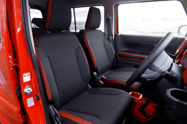 ハスラーのシートは、ブラックを基調としたファブリックで、サイドにアクセントカラーが入っています。アクセントカラーは、オレンジ、ブルー、グレーの3色あり、インパネの3つのベゼルにも同じ色が設定されます。
