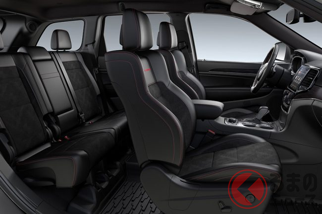 また、レッドの牽引フックやTrail Ratedバッジ、レッドのアクセントカラーをあしらったナチラルグレーのJeepバッジおよびGrand Cherokeeバッジがアイキャッチとなり、車体を保護するスキッドプレートの視覚効果も相まって、本格オフローダーの血統を感じさせる。