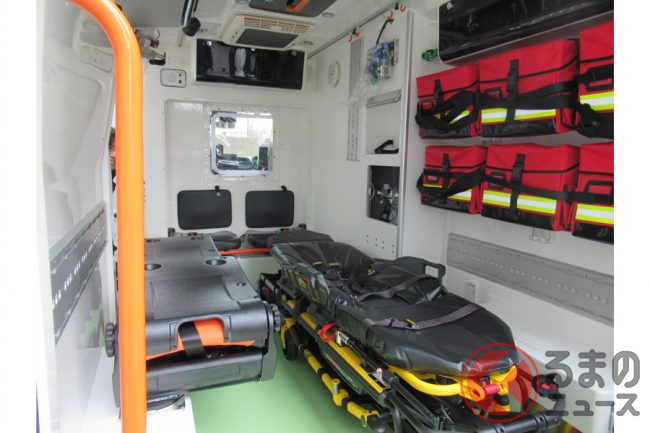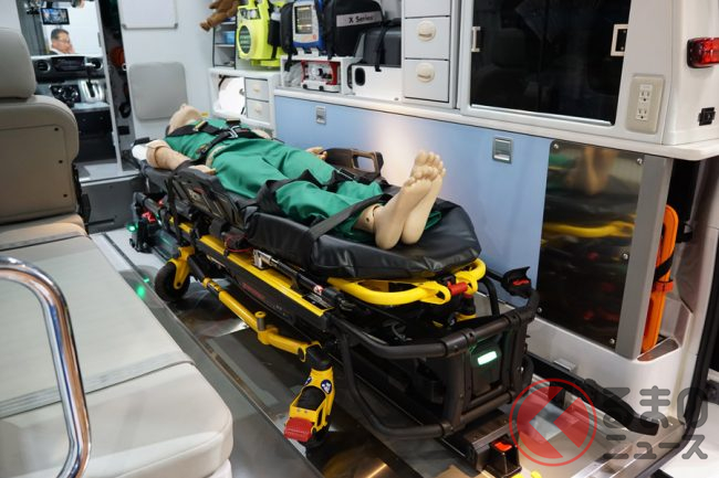 そして、消防救急車として初めて「電動ストレッチャー」を搭載していることも大きな特徴となります。電動ストレッチャーは、体格の大きな外国人や重体重の傷病者への対応力を強化するとともに、隊員の負担を大幅に減らす効果があり、欧米では電動ストレッチャーの普及が進んでいます。