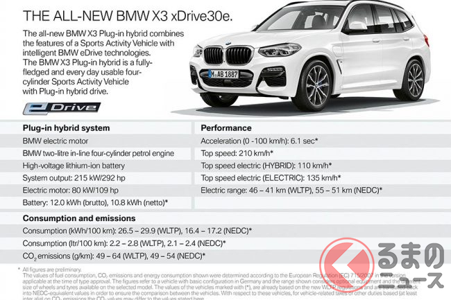 BMWはプレミアムミドルクラスSAV(スポーツ・アクティビティ・ヴィークル)の先駆的モデルである「X3」のラインアップに、初のプラグインハイブリッドモデル新型「X3 xDrive30e(エックス・ドライブ・サンマル・イー)」を追加し、販売を開始した。