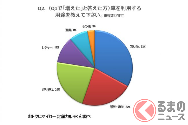 また、クルマの利用が増えたと答えた人を対象に、クルマを利用する用途を聞いたところ、買い物が182人(33%)、通勤・通学が122人(22%)、送り迎えが122人(22%)、レジャーが62人(11%)、避難が45人(8%)、その他が17人(3%)という結果でした。