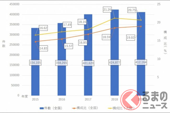 2019年度には2015年度と比べて7万8059件増の41万2164件(2015年度比123.36%)の要請がありました。