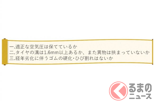 そうした現状を受け、JAFはタイヤに関する「ロードサービス隊直伝! 3つのチェックポイント」を公開しています。