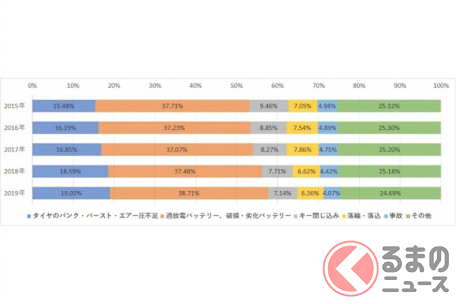 JAF大阪支部は、2019年度の大阪府内のタイヤトラブルに関するロードサービス救援件数を公開。近年、JAFへのタイヤに関する救援要請が増加しています。
