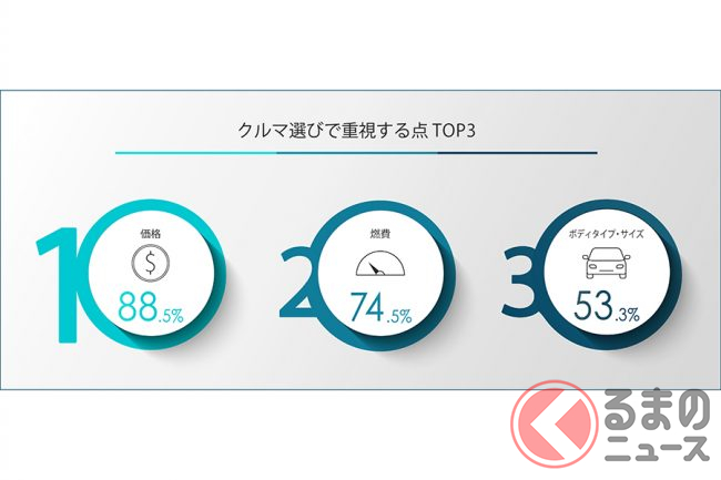 調査では、「次にクルマの購入・買い替えをするときに重視するのはどのような点ですか」という質問をしたところ、88.5%が「価格」と回答。次いで、「燃費」が74.5%、「ボディタイプ・サイズ・大きさ(積載人数、 積載量)」には53.3%の回答が集まる結果となった。