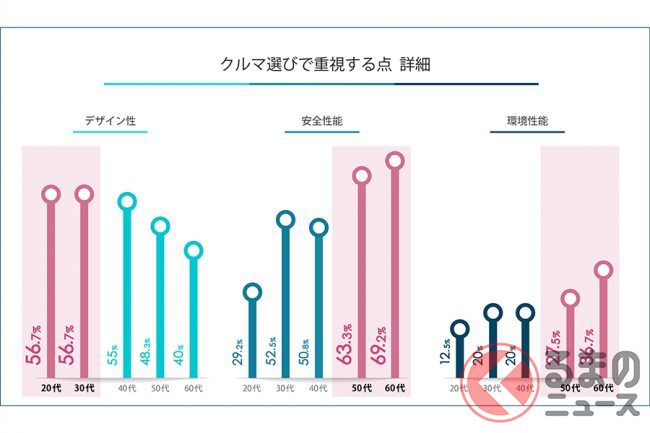 また、年齢によって重視するポイントが異なることが判明。「デザイン性」の選択肢に着目すると、若い人ほどスコアが高い結果となった一方で、「安全性能」、「環境性能」の選択肢に着目すると、年齢が増すほどスコアが高いことが明らかとなった。