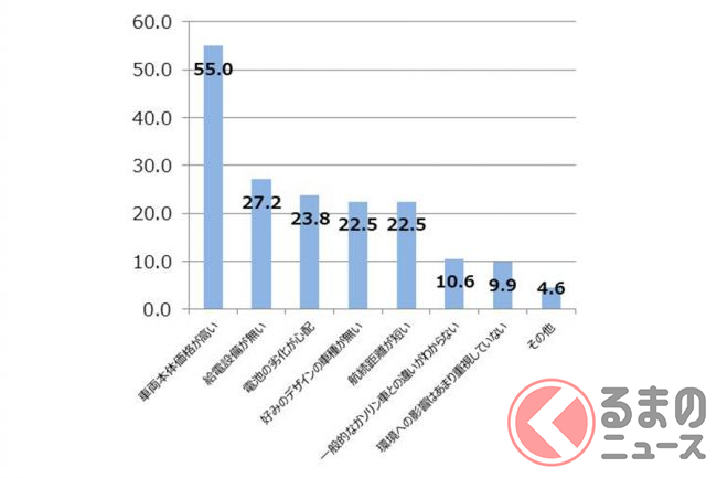 さらに、次世代車に魅力を感じない151名を対象に「次世代車に対して魅力を感じないと答えた理由として、当てはまるものをすべてお選びください」と質問したところ、最も多い55%が「車両本体価格が高い」と回答。ほかの選択肢と比較しても非常に高いスコアとなった。これらの調査結果から、次世代車普及において、車両価格が課題として挙げられることが明確となった。
