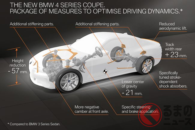3シリーズセダンと比較して車高が57mm低い新型4シリーズクーペ