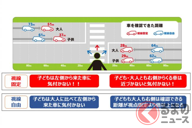 JAFがおこなったユーザーテストでは、子どもの視野角は大人の70%程度で、とくに左側から来たクルマに気づきにくいとの結果が出ています。