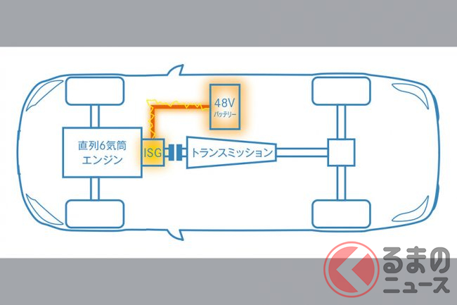 スターター・ジェネレーターはエンジンとベルトでつながっており、減速時のエンジンの回転力を利用して発電する。その電流を二次電池に貯める。そのときの電圧が48Vであるため「48Vマイルドハイブリッド」という名称になった。