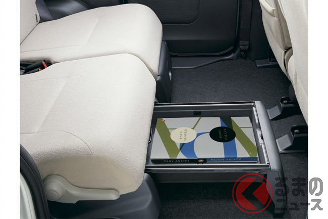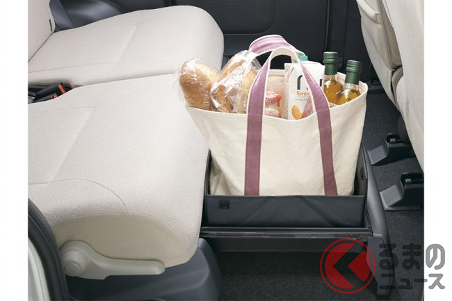 一方ムーヴキャンバスは、スライドドアにミラクルオープンドアのような特別な仕掛けはないものの、後席座面下の「置きラクボックス」が特徴的。運転席からも手が届く距離で、フロアに直接置きたくない荷物でも、汚れを気にせず載せることができます。