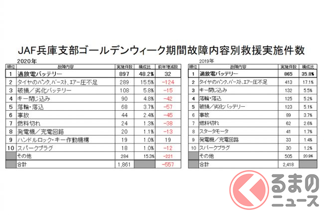 JAF兵庫支部は、兵庫県内におけるゴールデンウイーク期間中のロードサービスの故障内容別救援実施件数を発表しました。