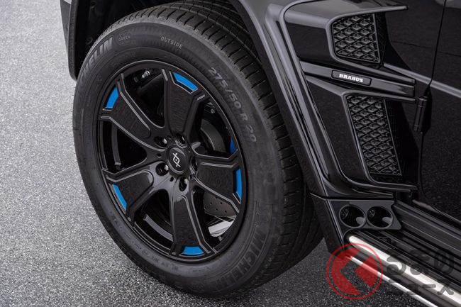 20インチ径のミシュラン製ランフラットタイヤやブラバス・オリジナルのホイールは、もちろん相手からの攻撃を考えたタフなデザインと性能を持っている。