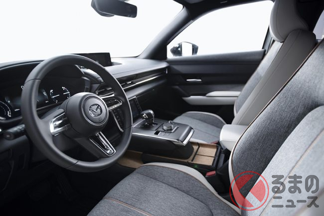 MX-30は前輪駆動(FF)で、145psを発生するモーターと35.5kWhのリチウムイオンバッテリーを組み合わせ、WLTPモードで約200km走行することが可能だ。バッテリーはDC急速充電を用いると、約40分で80%まで充電できる。