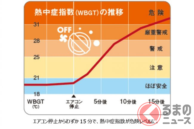 JAFが実施した車内温度の検証テストによると、気温35℃の炎天下に駐車した車内の熱中症指数は、窓を閉め切った状態でエンジン停止後、わずか15分で人体にとって危険なレベルに達する結果となっています。