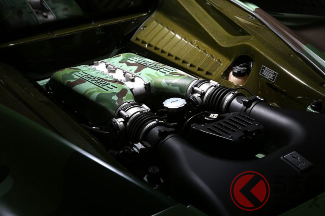 そしてガレージ・イタリアでは、フェラーリ「458イタリア」を迷彩色でコーディネートしたこともある。こうした外板色のカスタムは、フルラッピングだと思われるだろうが、458イタリアは塗装で仕上げられているのが特徴だ。