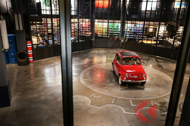 階段の横を通ってさらに奥へ進むと、ガレージイタリアのショールームへとつながっている。床には大きくガレージ・イタリアの丸いマークが描かれており、ちょうど真上にある天窓から自然光が降り注いでいる。