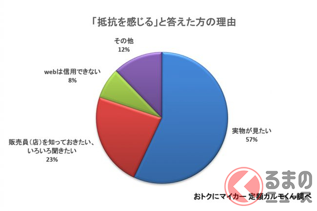 また、抵抗を感じる理由としては、「実物が見たいから」が57%、「販売員(店)を知っておきたい、 いろいろ聞きたいから」が23%、「WEBは信用できないから」が8%で、具体的には、「実際にクルマを見てみないと後悔する」、「ハンドルの固さやシートの座り心地などを実際に確かめたい」、「PCのモニターからだと、 車内の質感や装備品の使い勝手がわからないから」、「長く乗るものだし、高額の出費を伴うので、乗り心地などを確認したい」といった、実物を見て感じたいという声が過半数でした。