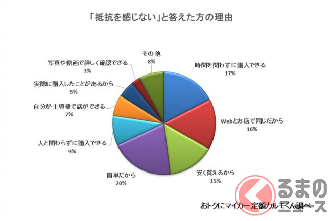抵抗を感じないと答えた人の理由としては、「時間を問わずに購入できる」が17%、「WEBとお店で(情報は)同じだから」が16%、「安く買えるから」が15%、「(Webのほうが)簡単だから」が20%、「人と関わらずに購入できる」が9%、「自分が主導権で話ができる」が7%、「実際に購入したことがあるから」が5%、「写真や動画で詳しく確認できる」が3%でした。