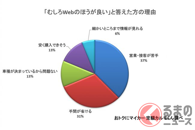 むしろWEBのほうが良いと答えた人の理由は、「営業・接客が苦手」が37%、「手間が省ける」が31%、「車種が決まっているから問題ない」が13%、「安く購入できそう」が13%、「細かいところまで情報が見れる」が6%でした。