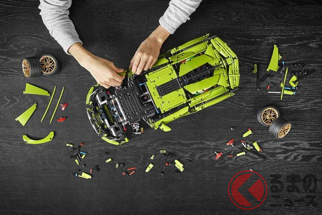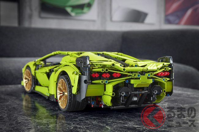 さらに、レゴテクニックがつくるレプリカの鮮やかなライムグリーンの色とエレガントなゴールデンリムは、本物のシアンのカラーとトリムが使用されており、構成ピースは3696ピース。全高5インチ(13cm)、長さ23インチ(60cm)、幅9インチ(25cm)の1/8スケールモデルだ。