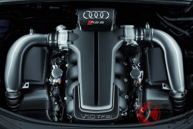 RS6/RS6アバントにおける最大のトピックであるパワーユニットは、ランボルギーニ・ガヤルドにも搭載された5リッターV10ユニットに、2基のターボチャージャーを装着した新開発エンジンであった。